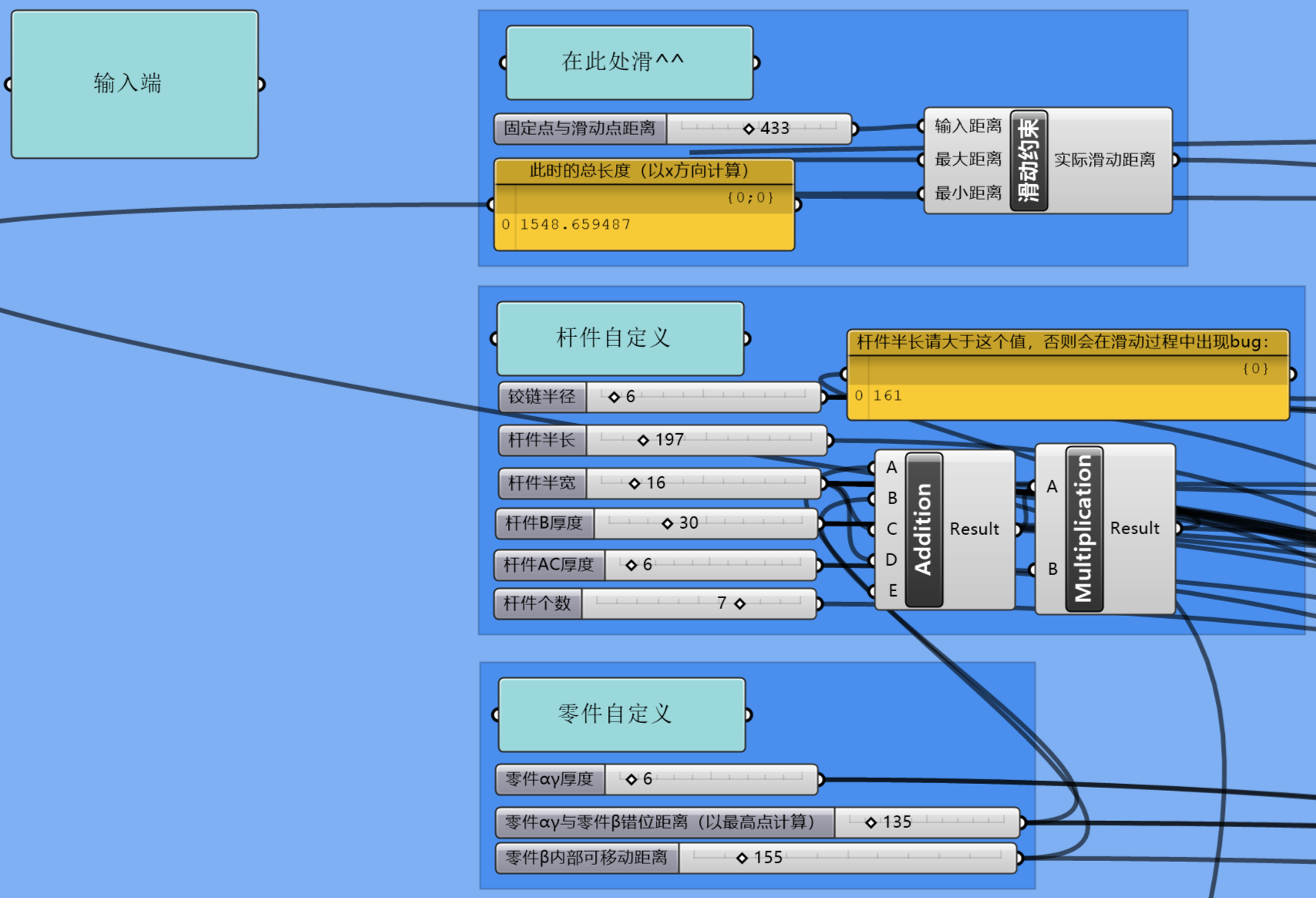 此外,某个角落涉及gh的精度问题。gh文件中共有2个C#脚本……那串名字特别长的就是为了解决这个问题(擦汗)。当double数据小数点后的值小于某个特定值时,gh似乎会在某些显示层面将其省略。但在值的相关运算中,小数点后的值依然是存在的,因此出现了0>0为true的情况……于是我在脚本里设置了一个足够小的容差,将比其还小的差值直接省略。不过这是一种比较局限的用法,这样做是因为此精度在此具体情况中的确可被省去。